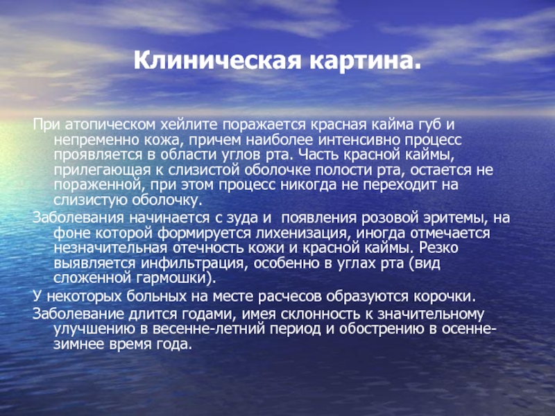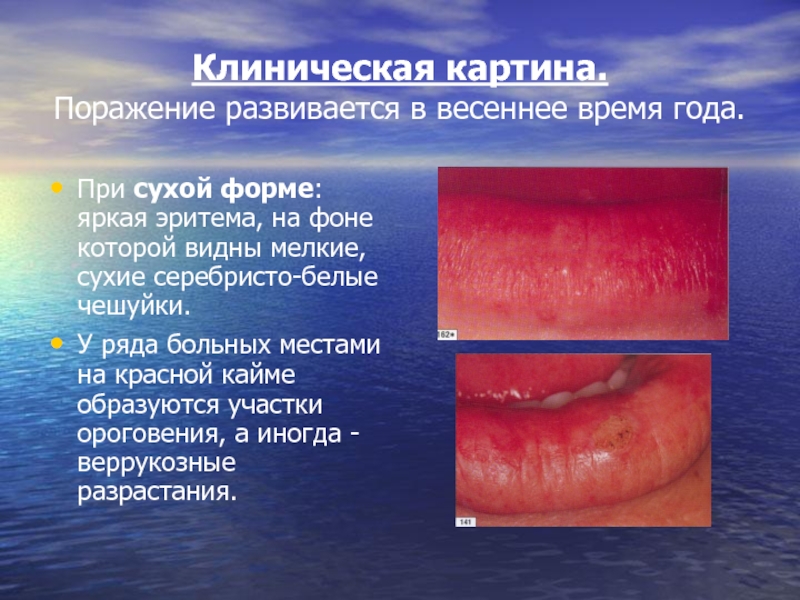 Симптомы. Сухость, чувство стягивания, онемение губ, появление чешуек на красной кайме при сухой форме и боль, наличие чешуйко-корок на красной кайме при экссудативной формах.