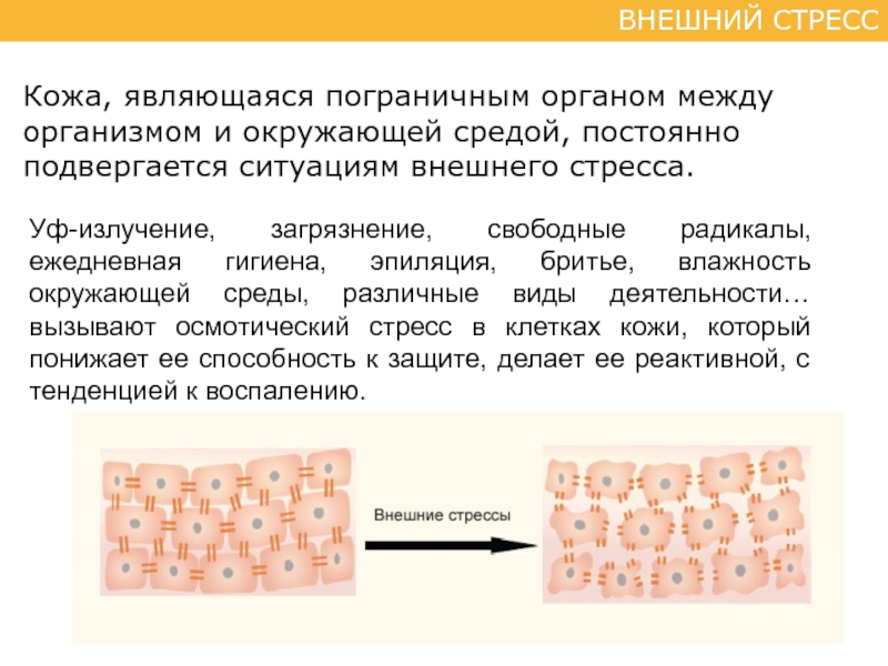 Слайд 11Внешний стресс вызывает нарушение целостности эпидермиса: