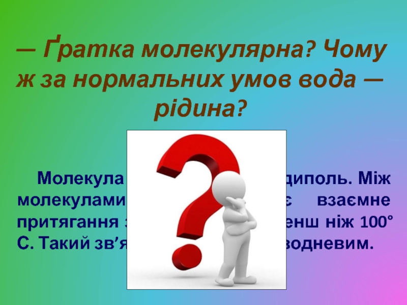 Слайд 8— Ґратка молекулярна? Чому ж за нормальних умов вода —