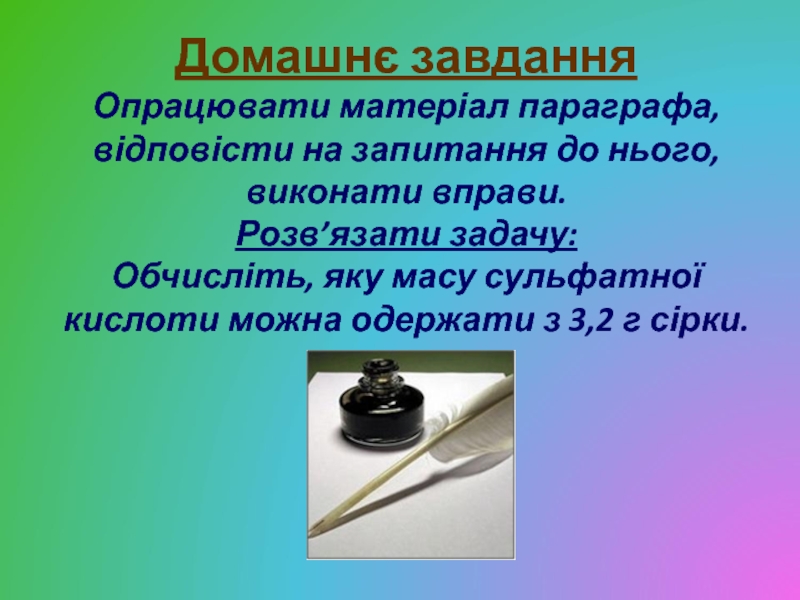 вправи. Розв’язати задачу: Обчисліть, яку масу сульфатної кислоти можна одержати з 3,2