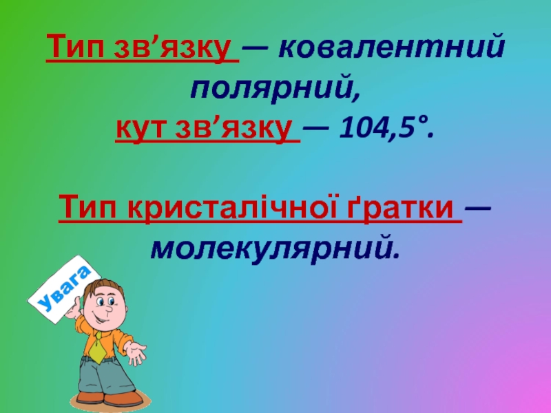 Слайд 7Тип зв’язку — ковалентний полярний, кут зв’язку — 104,5°. Тип
