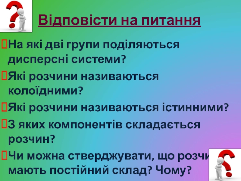 Відповісти на питанняНа які дві групи поділяються дисперсні системи?Які розчини називаються колоїдними?Які розчини називаються істинними?З яких компонентів