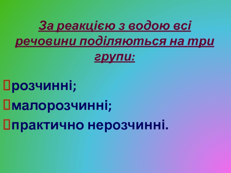 За реакцією з водою всі речовини поділяються на три групи: розчинні;малорозчинні;практично нерозчинні.