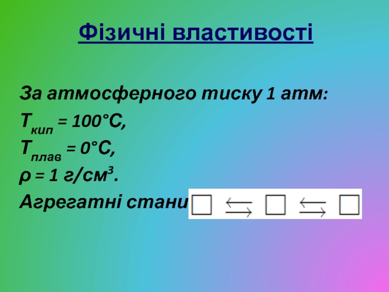 Фізичні властивостіЗа атмосферного тиску 1 атм:Ткип = 100°С,Тплав = 0°С,ρ = 1 г/см3.Агрегатні стани: