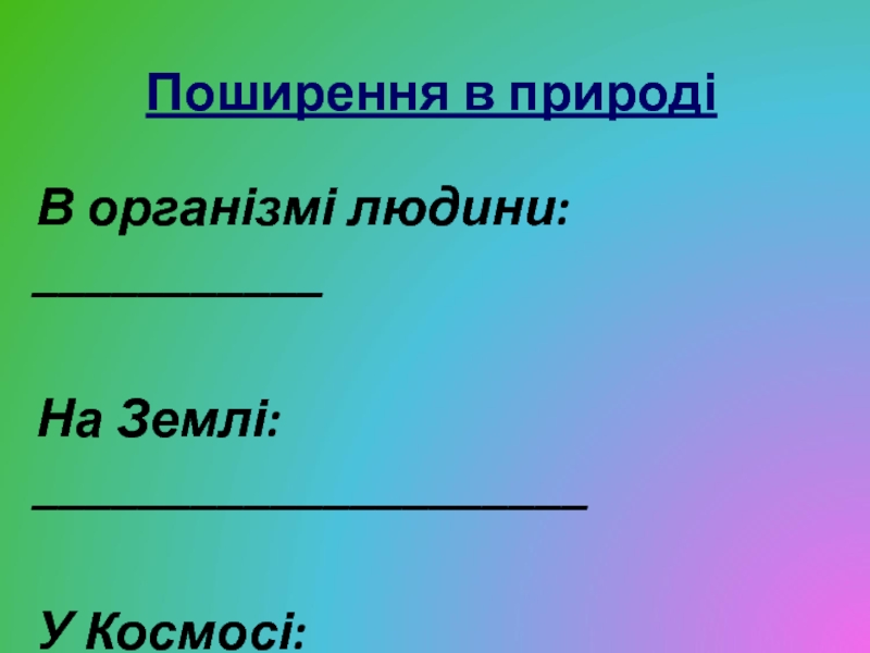 Поширення в природіВ організмі людини: ___________На Землі: _____________________У Космосі: ____________________