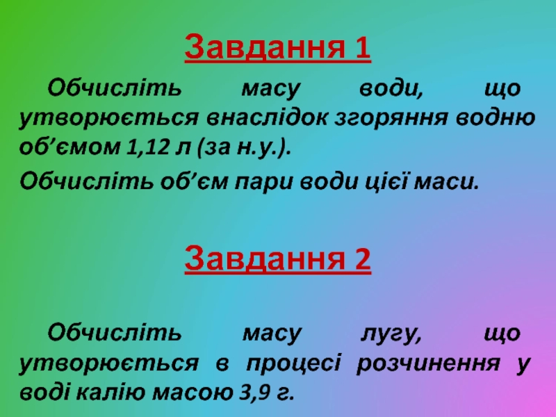 Завдання 1	Обчисліть масу води, що утворюється внаслідок згоряння водню об’ємом 1,12 л (за н.у.).Обчисліть об’єм пари води