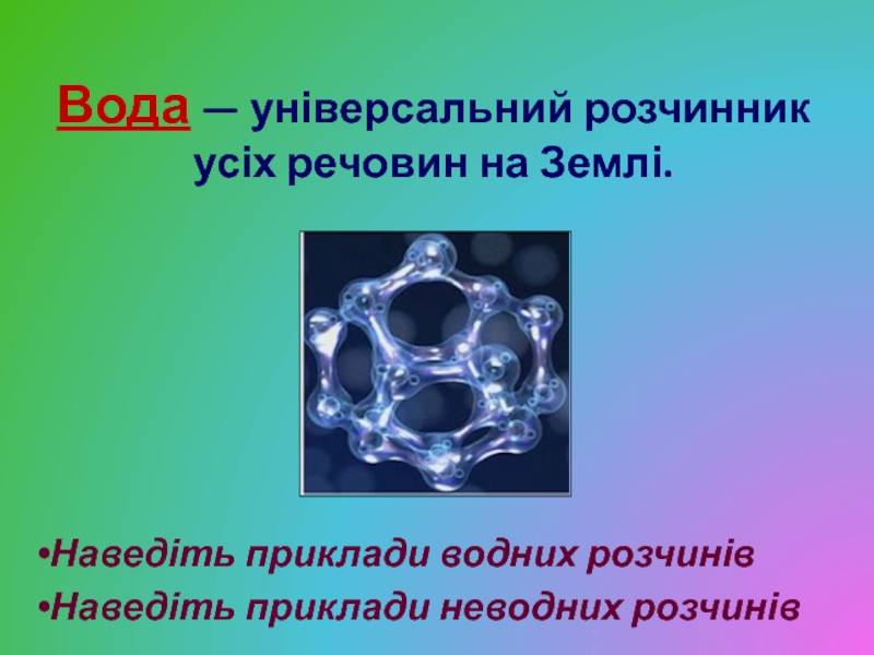 Слайд 1Розчин та його компоненти: розчинник, розчинена речовина. Вода як розчинник.