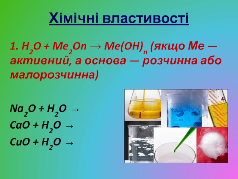 Хімічні властивості1. H2O + Me2On → Me(OH)n (якщо Ме — активний, а основа — розчинна або малорозчинна)Na2O