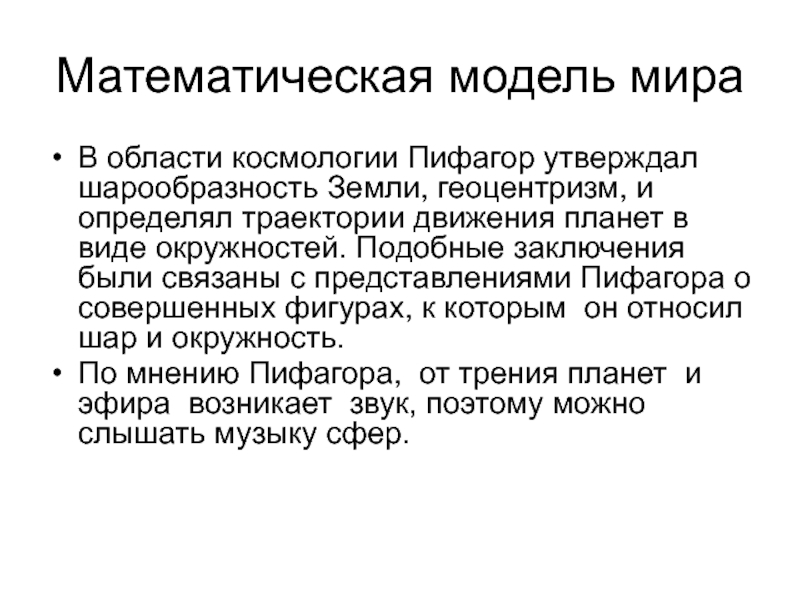 В области космологии Пифагор утверждал шарообразность Земли, геоцентризм,