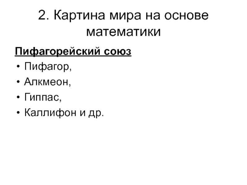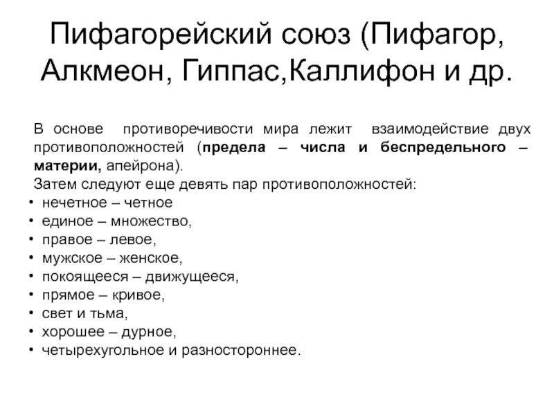 Слайд 18Пифагорейский союз (Пифагор, Алкмеон, Гиппас,Каллифон и др.