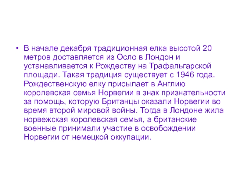 Такая традиция существует с 1946 года. Рождественскую елку присылает в Англию королевская семья Норвегии в знак признательности за помощь, которую Британцы оказали Норвегии во время второй мировой войны. Тогда в Лондоне жила норвежская королевская семья, а британские военные принимали участие в освобождении Норвегии от немецкой оккупации.