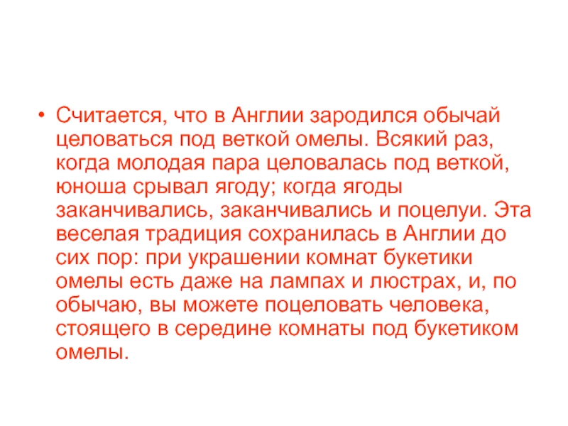 Слайд 4Считается, что в Англии зародился обычай целоваться под веткой омелы.