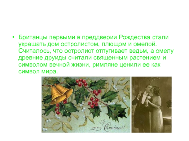 и омелой. Считалось, что остролист отпугивает ведьм, а омелу древние