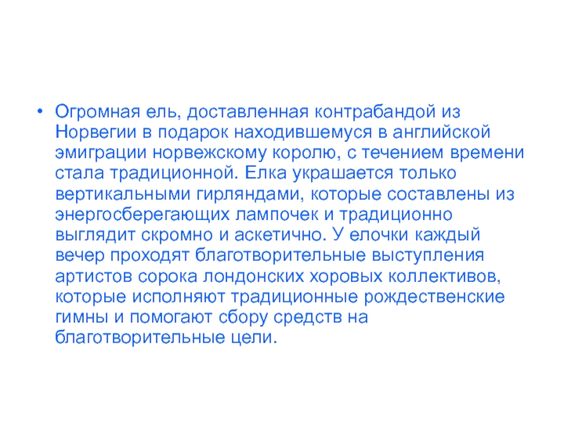 Слайд 22Огромная ель, доставленная контрабандой из Норвегии в подарок находившемуся в