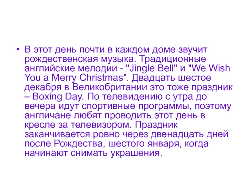 a Merry Christmas". Двадцать шестое декабря в Великобритании это тоже праздник – Boxing Day. По телевидению с утра до вечера идут спортивные программы, поэтому англичане любят проводить этот день в кресле за телевизором. Праздник заканчивается ровно через двенадцать дней после Рождества, шестого января, когда начинают снимать украшения.