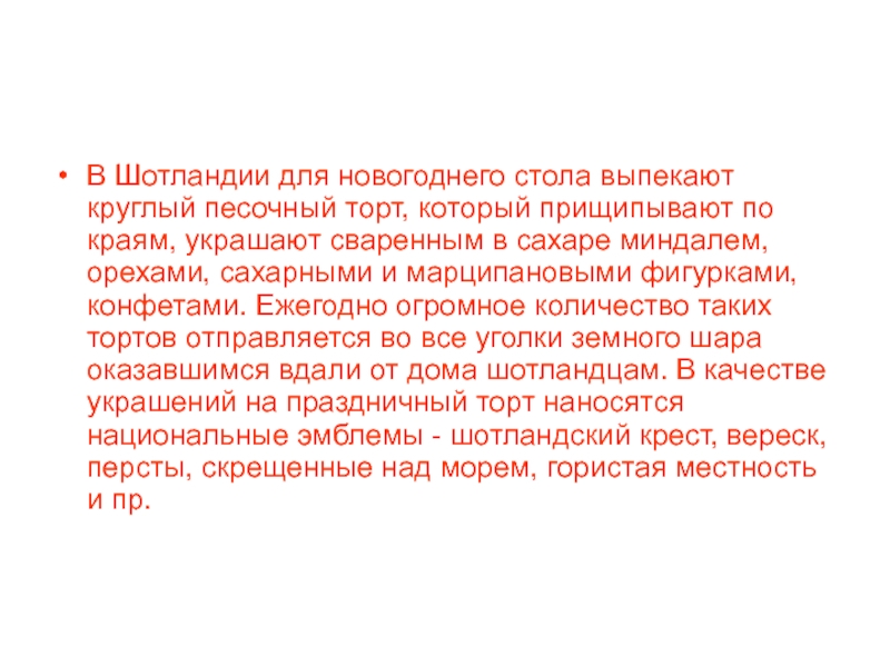 Слайд 26В Шотландии для новогоднего стола выпекают круглый песочный торт, который