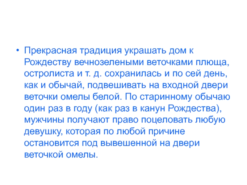 обычай, подвешивать на входной двери веточки омелы белой. По старинному обычаю один раз в году (как раз в канун Рождества), мужчины получают право поцеловать любую девушку, которая по любой причине остановится под вывешенной на двери веточкой омелы.