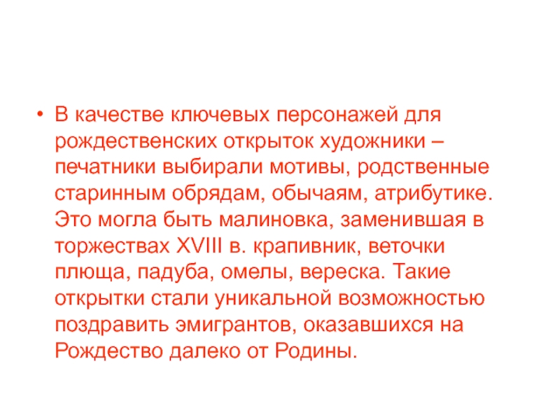 малиновка, заменившая в торжествах XVIII в. крапивник, веточки плюща, падуба, омелы, вереска. Такие открытки стали уникальной возможностью поздравить эмигрантов, оказавшихся на Рождество далеко от Родины.