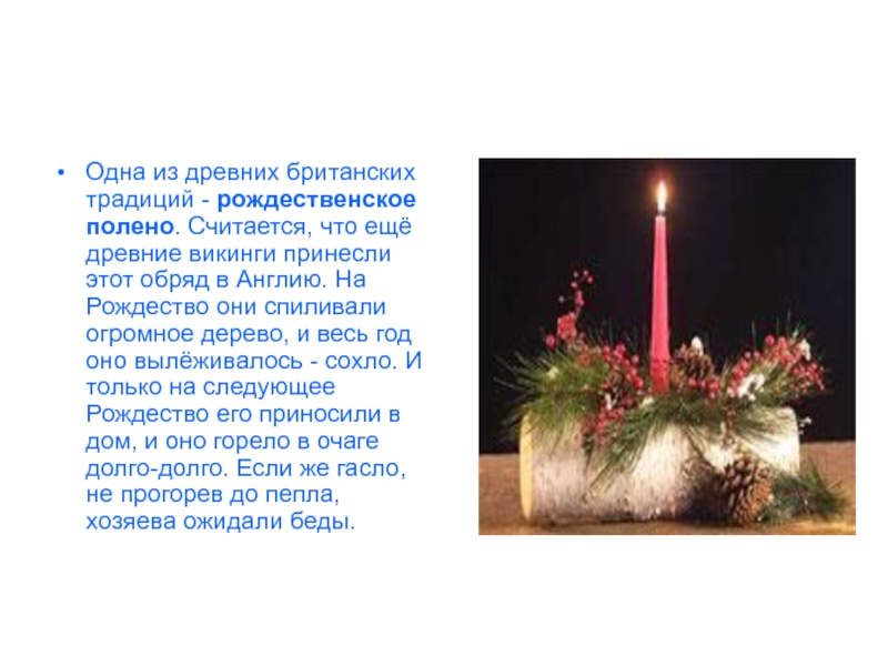 Слайд 5Одна из древних британских традиций - рождественское полено. Считается, что ещё
