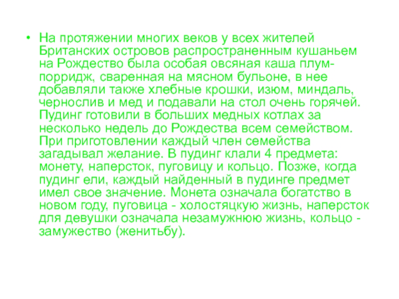 мясном бульоне, в нее добавляли также хлебные крошки, изюм, миндаль, чернослив и мед и подавали на стол очень горячей. Пудинг готовили в больших медных котлах за несколько недель до Рождества всем семейством. При приготовлении каждый член семейства загадывал желание. В пудинг клали 4 предмета: монету, наперсток, пуговицу и кольцо. Позже, когда пудинг ели, каждый найденный в пудинге предмет имел свое значение. Монета означала богатство в новом году, пуговица - холостяцкую жизнь, наперсток для девушки означала незамужнюю жизнь, кольцо - замужество (женитьбу).