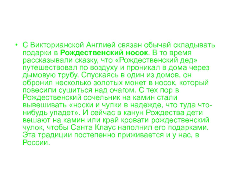 Слайд 7С Викторианской Англией связан обычай складывать подарки в Рождественский носок.