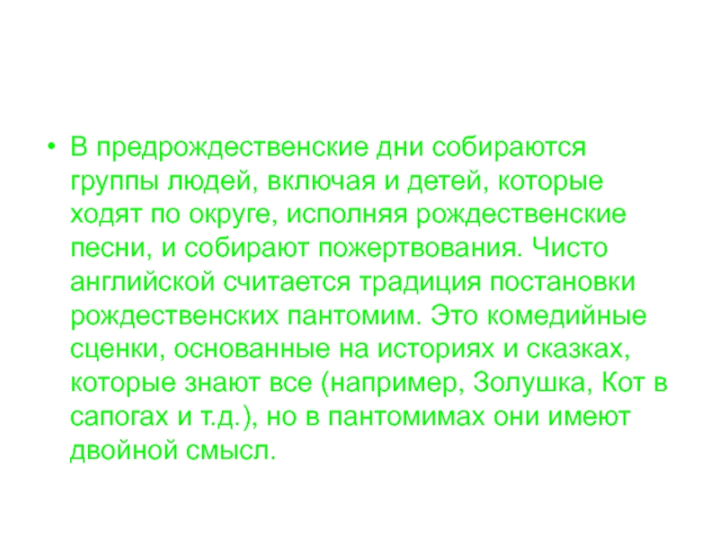 английской считается традиция постановки рождественских пантомим. Это комедийные сценки, основанные на историях и сказках, которые знают все (например, Золушка, Кот в сапогах и т.д.), но в пантомимах они имеют двойной смысл.