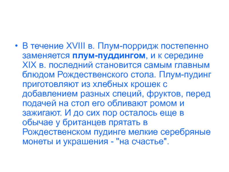 Слайд 13В течение XVIII в. Плум-порридж постепенно заменяется плум-пуддингом, и к середине