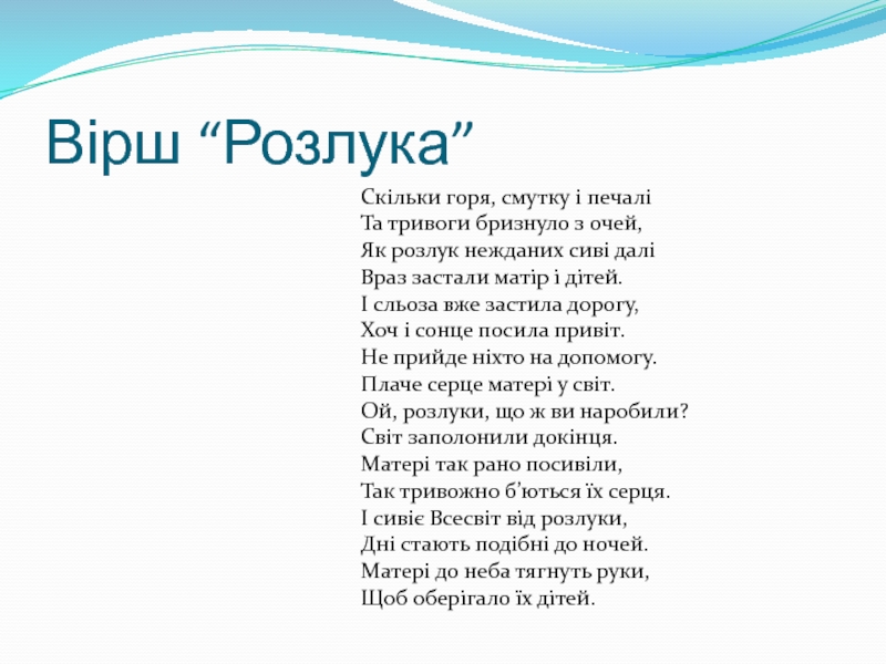 Вірш “Розлука”Скільки горя, смутку і печалі Та тривоги бризнуло з очей, Як розлук нежданих сиві далі Враз застали матір і дітей. І сльоза вже застила дорогу, Хоч і сонце посила привіт.