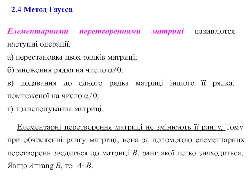 Елементарні перетворення матриці не змінюють її рангу. Тому при обчисленні рангу матриці, вона за допомогою елементарних перетворень зводиться до матриці В, ранг якої легко знаходиться. Якщо A=rang B, то AB.