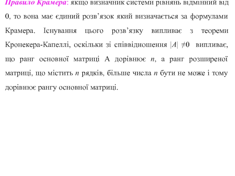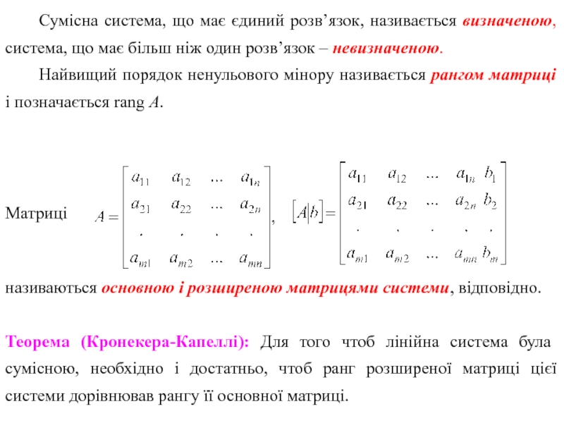 Теорема (Кронекера-Капеллі): Для того чтоб лінійна система була сумісною, необхідно і достатньо, чтоб ранг розширеної матриці цієї системи дорівнював рангу її основної матриці.