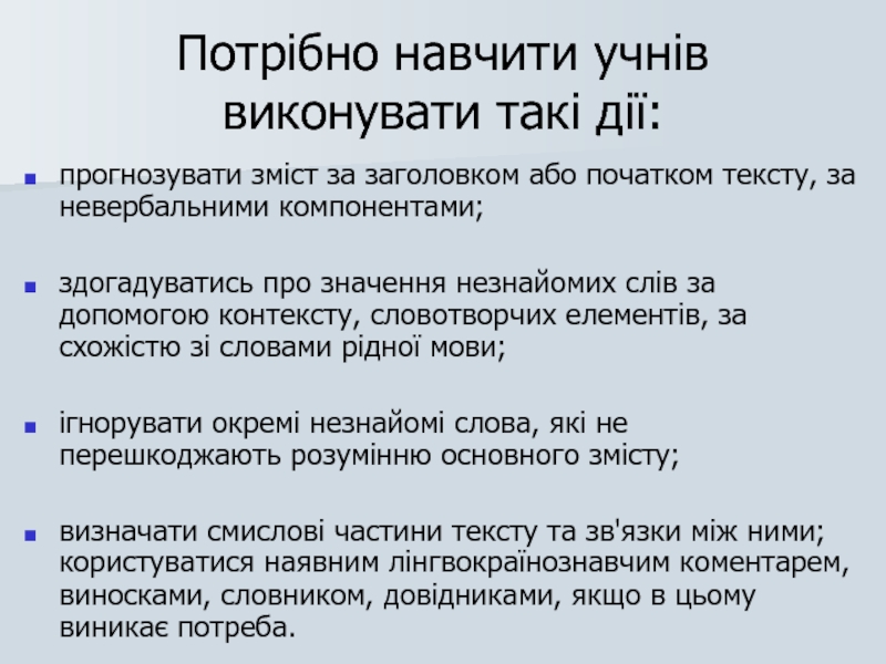 ігнорувати окремі незнайомі слова, які не перешкоджають розумінню основного змісту;