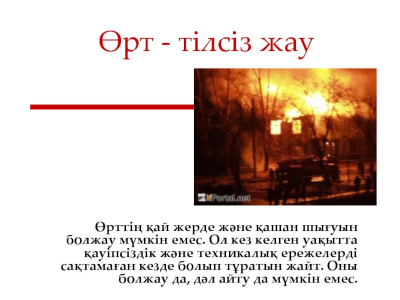 Өрт - тілсіз жауӨрттің қай жерде және қашан шығуын болжау мүмкін емес. Ол кез келген уақытта қауіпсіздік