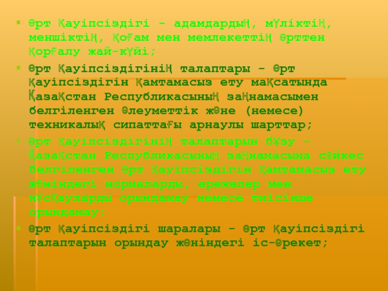 өрт қауіпсіздігі - адамдардың, мүліктің, меншіктің, қоғам мен мемлекеттің өpттeн қорғалу жай-күйі;өрт қауіпсіздігінің талаптары - өрт қауіпсіздігін