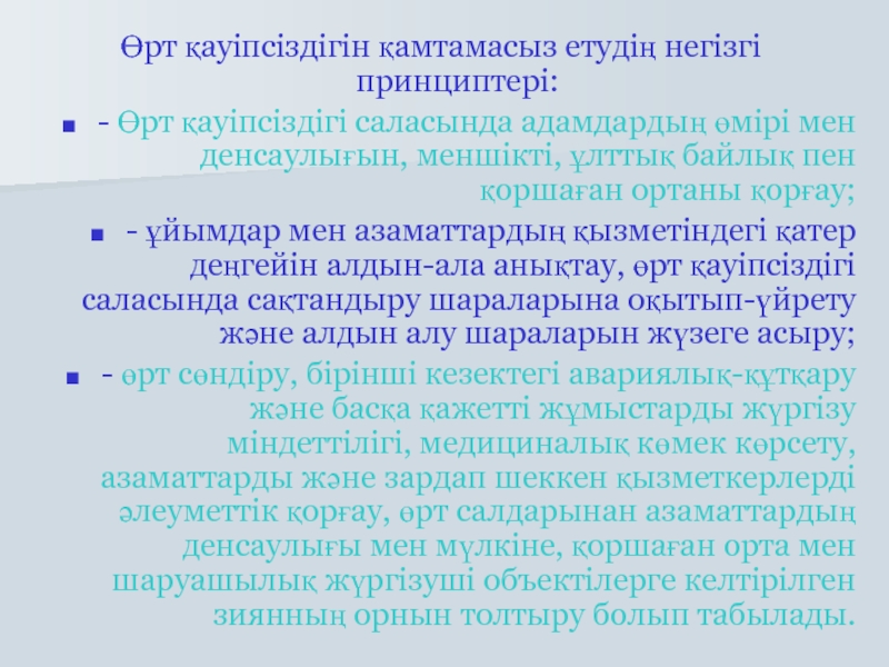 Өрт қауiпсiздiгiн қамтамасыз етудiң негiзгi принциптерi: - Өрт қауiпсiздiгi саласында адамдардың өмiрi мен денсаулығын, меншiктi, ұлттық байлық
