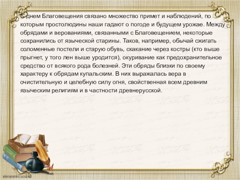 и верованиями, связанными с Благовещением, некоторые сохранились от языческой старины. Таков, например, обычай сжигать соломенные постели и старую обувь, скакание через костры (кто выше прыгнет, у того лен выше уродится), окуривание как предохранительное средство от всякого рода болезней. Эти обряды близки по своему характеру к обрядам купальским. В них выражалась вера в очистительную и целебную силу огня, свойственная всем древним языческим религиям и в частности древнерусской.
