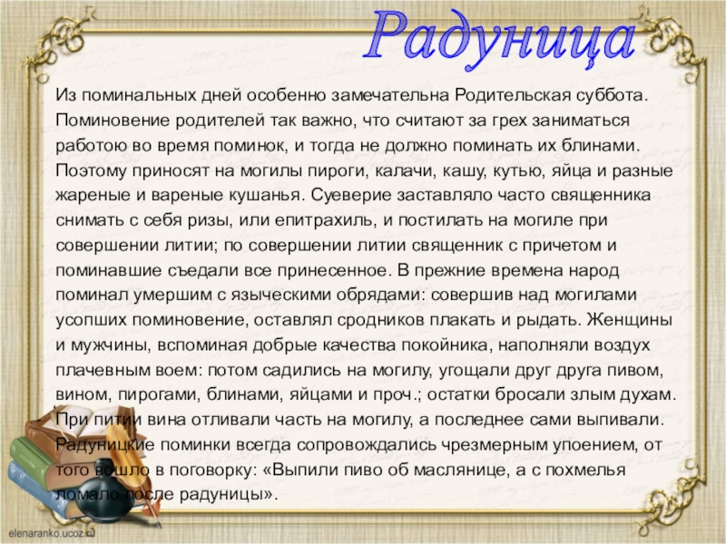 Слайд 30Из поминальных дней особенно замечательна Родительская суббота. Поминовение родителей так