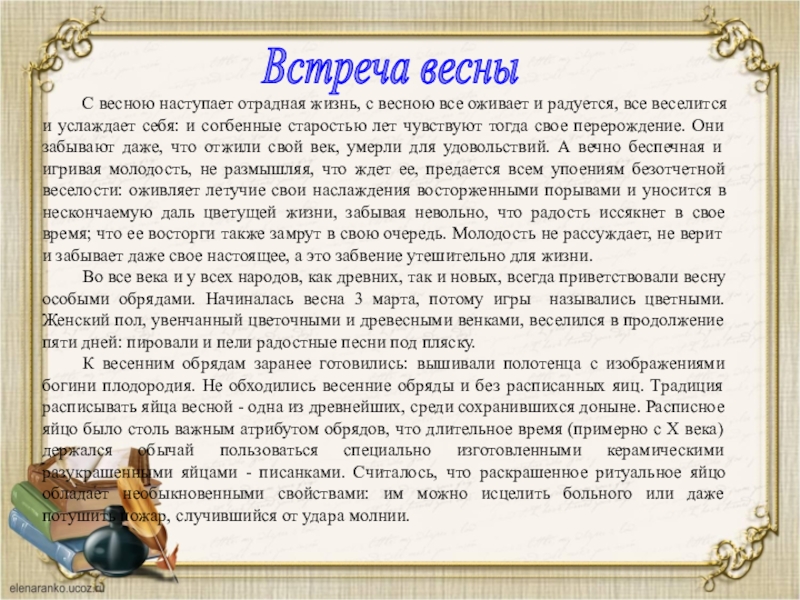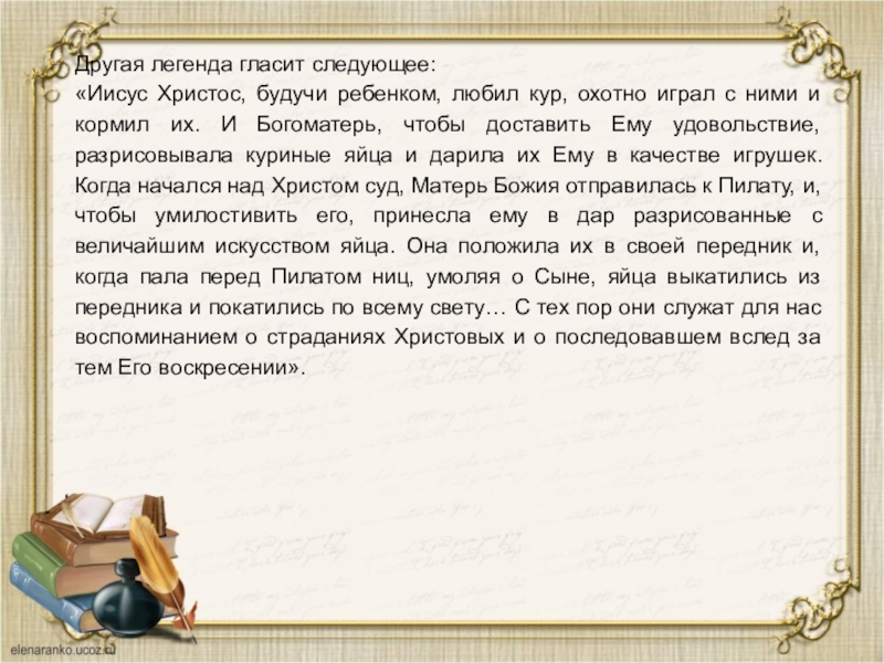 Ему удовольствие, разрисовывала куриные яйца и дарила их Ему в качестве игрушек. Когда начался над Христом суд, Матерь Божия отправилась к Пилату, и, чтобы умилостивить его, принесла ему в дар разрисованные с величайшим искусством яйца. Она положила их в своей передник и, когда пала перед Пилатом ниц, умоляя о Сыне, яйца выкатились из передника и покатились по всему свету… С тех пор они служат для нас воспоминанием о страданиях Христовых и о последовавшем вслед за тем Его воскресении».