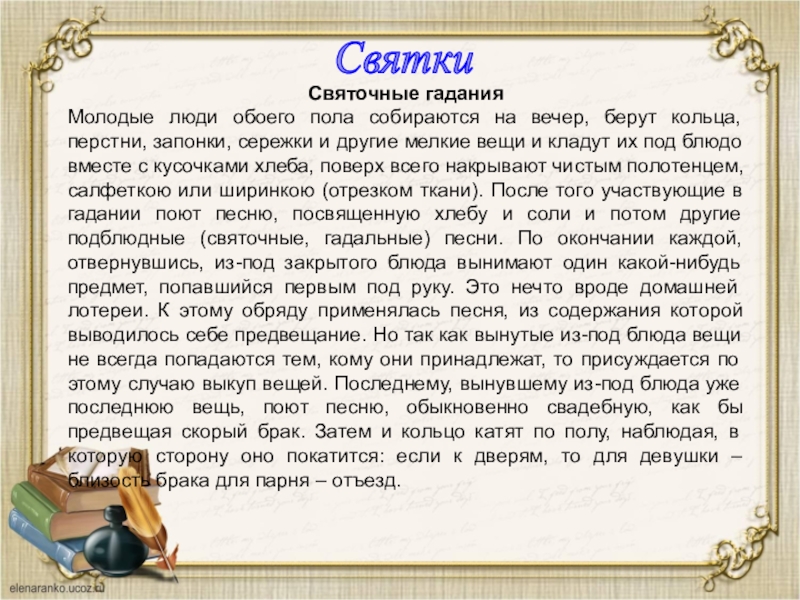 под блюдо вместе с кусочками хлеба, поверх всего накрывают чистым полотенцем, салфеткою или ширинкою (отрезком ткани). После того участвующие в гадании поют песню, посвященную хлебу и соли и потом другие подблюдные (святочные, гадальные) песни. По окончании каждой, отвернувшись, из-под закрытого блюда вынимают один какой-нибудь предмет, попавшийся первым под руку. Это нечто вроде домашней лотереи. К этому обряду применялась песня, из содержания которой выводилось себе предвещание. Но так как вынутые из-под блюда вещи не всегда попадаются тем, кому они принадлежат, то присуждается по этому случаю выкуп вещей. Последнему, вынувшему из-под блюда уже последнюю вещь, поют песню, обыкновенно свадебную, как бы предвещая скорый брак. Затем и кольцо катят по полу, наблюдая, в которую сторону оно покатится: если к дверям, то для девушки – близость брака для парня – отъезд.