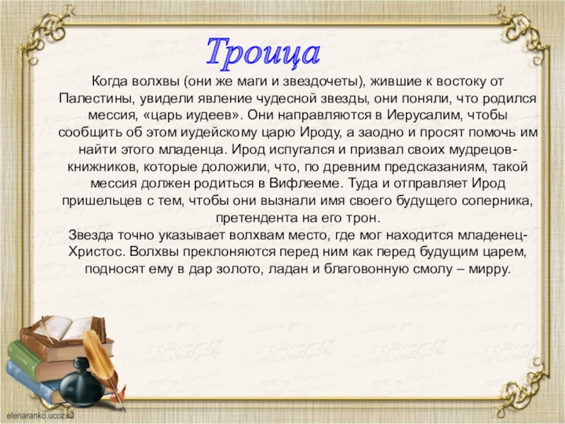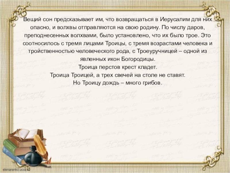 преподнесенных волхвами, было установлено, что их было трое. Это соотносилось с тремя лицами Троицы, с тремя возрастами человека и тройственностью человеческого рода, с Троеуручницей – одной из явленных икон Богородицы.