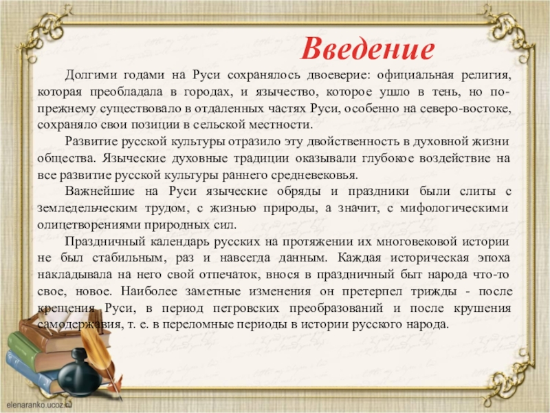 Праздничный календарь русских на протяжении их многовековой истории не был стабильным, раз и навсегда данным. Каждая историческая эпоха накладывала на него свой отпечаток, внося в праздничный быт народа что-то свое, новое. Наиболее заметные изменения он претерпел трижды - после крещения Руси, в период петровских преобразований и после крушения самодержавия, т. е. в переломные периоды в истории русского народа.