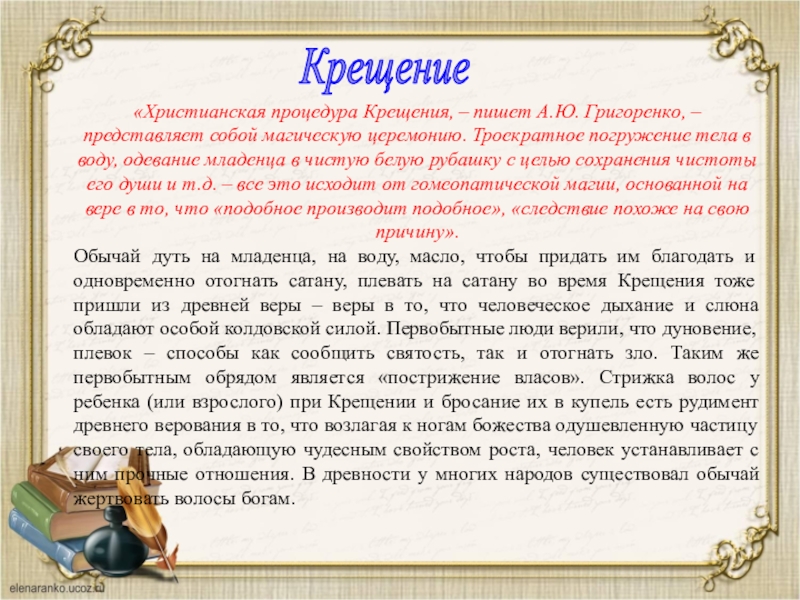 Слайд 13«Христианская процедура Крещения, – пишет А.Ю. Григоренко, – представляет собой магическую