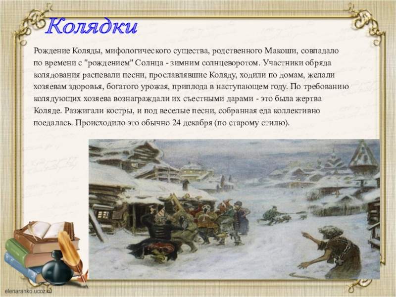 Слайд 11Рождение Коляды, мифологического существа, родственного Макоши, совпадало по времени с