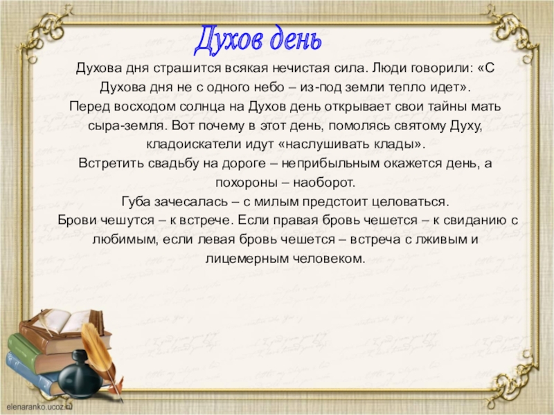 Слайд 34Духова дня страшится всякая нечистая сила. Люди говорили: «С Духова