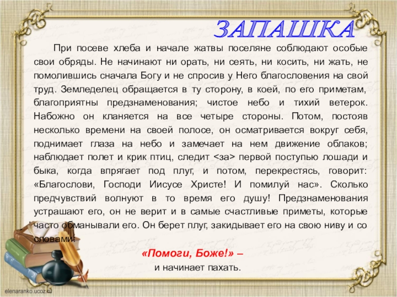 Слайд 35 При посеве хлеба и начале жатвы поселяне соблюдают особые свои