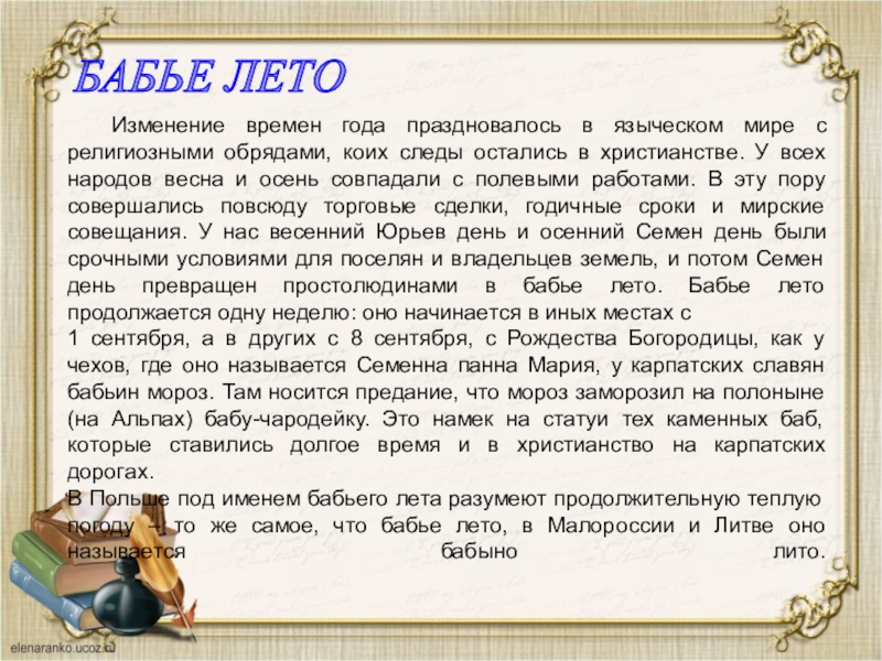 1 сентября, а в других с 8 сентября, с Рождества Богородицы, как у чехов, где оно называется Семенна панна Мария, у карпатских славян бабьин мороз. Там носится предание, что мороз заморозил на полоныне (на Альпах) бабу-чародейку. Это намек на статуи тех каменных баб, которые ставились долгое время и в христианство на карпатских дорогах.