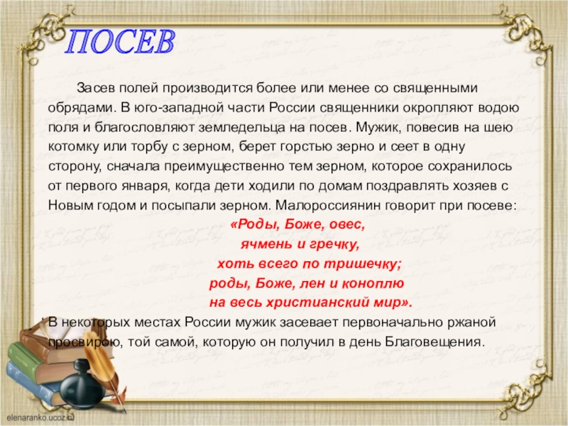 на посев. Мужик, повесив на шею котомку или торбу с зерном, берет горстью зерно и сеет в одну сторону, сначала преимущественно тем зерном, которое сохранилось от первого января, когда дети ходили по домам поздравлять хозяев с Новым годом и посыпали зерном. Малороссиянин говорит при посеве: