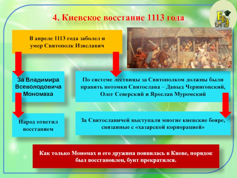 Как только Мономах и его дружина появилась в Киеве, порядок был восстановлен, бунт прекратился.