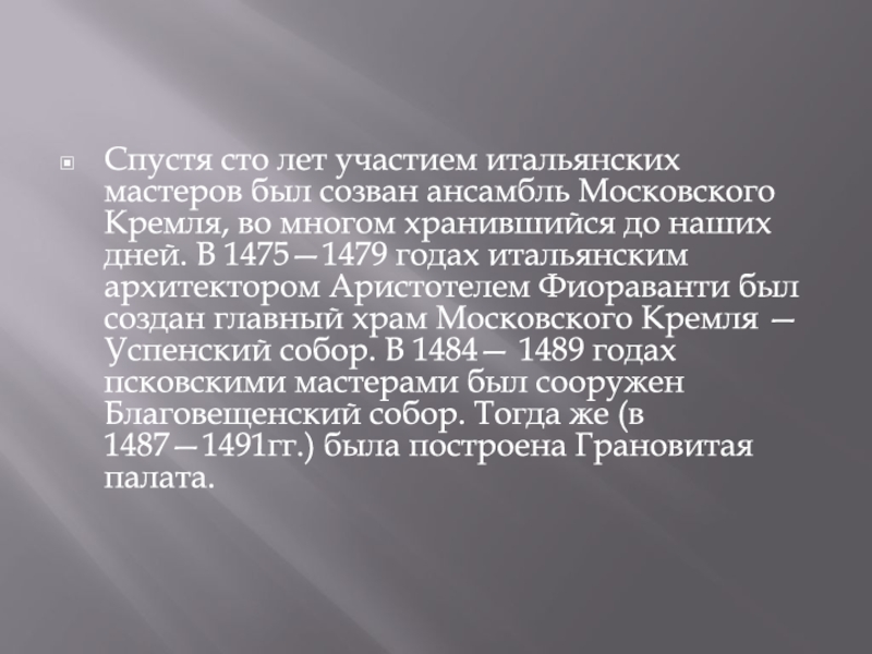 Спустя сто лет участием итальянских мастеров был созван ансамбль Московского Кремля, во многом хранившийся до наших дней.