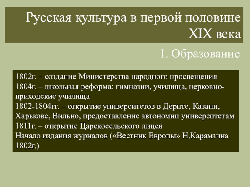 Под влиянием Отечественной войны 1812 года происходит становление романтизма (художественное направление в культуре конца XVIII — первой половины XIXв., характеризующееся утверждением ценности духовно-творческой жизни личности, изображением сильных страстей и характеров, одухотворённой природы.)