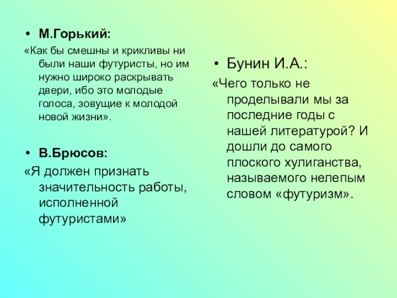 «Чего только не проделывали мы за последние годы с нашей литературой? И дошли до самого плоского хулиганства, называемого нелепым словом «футуризм».